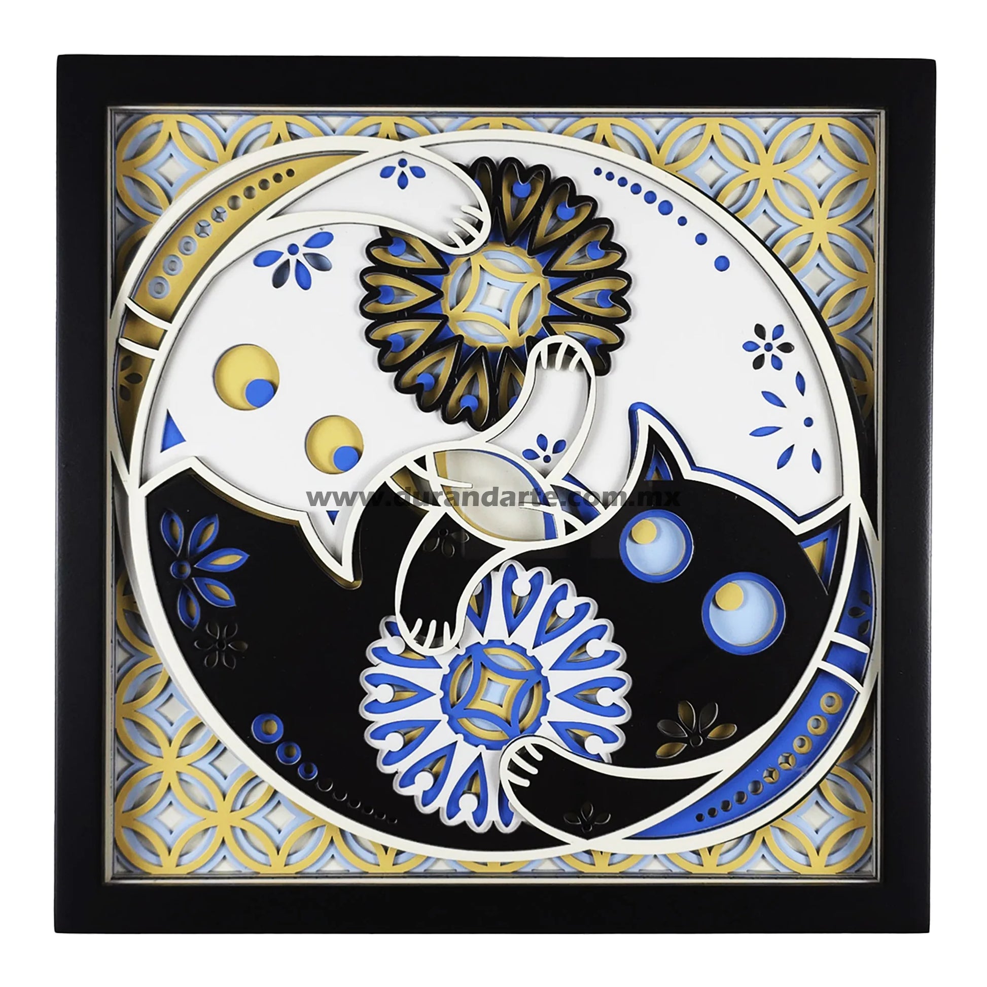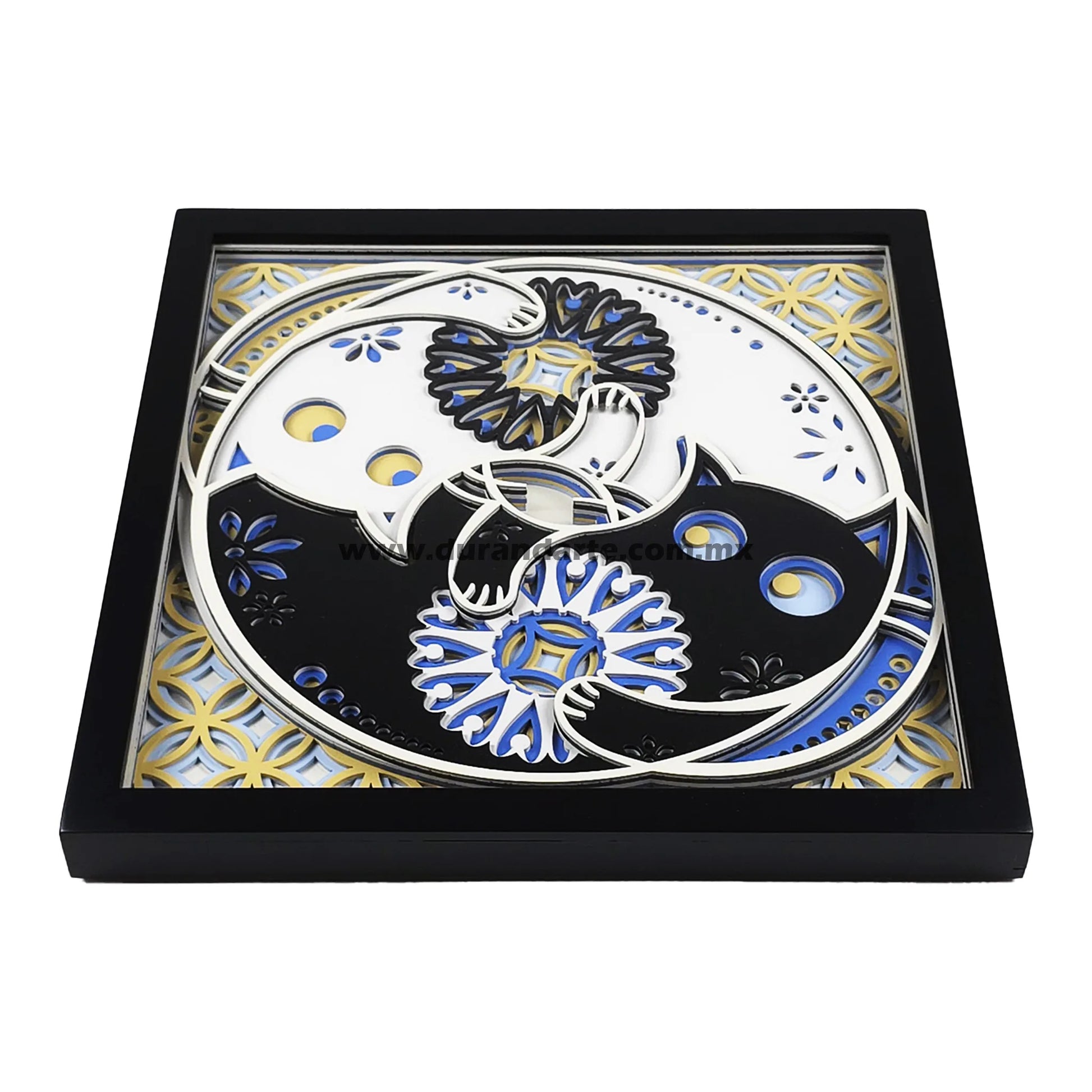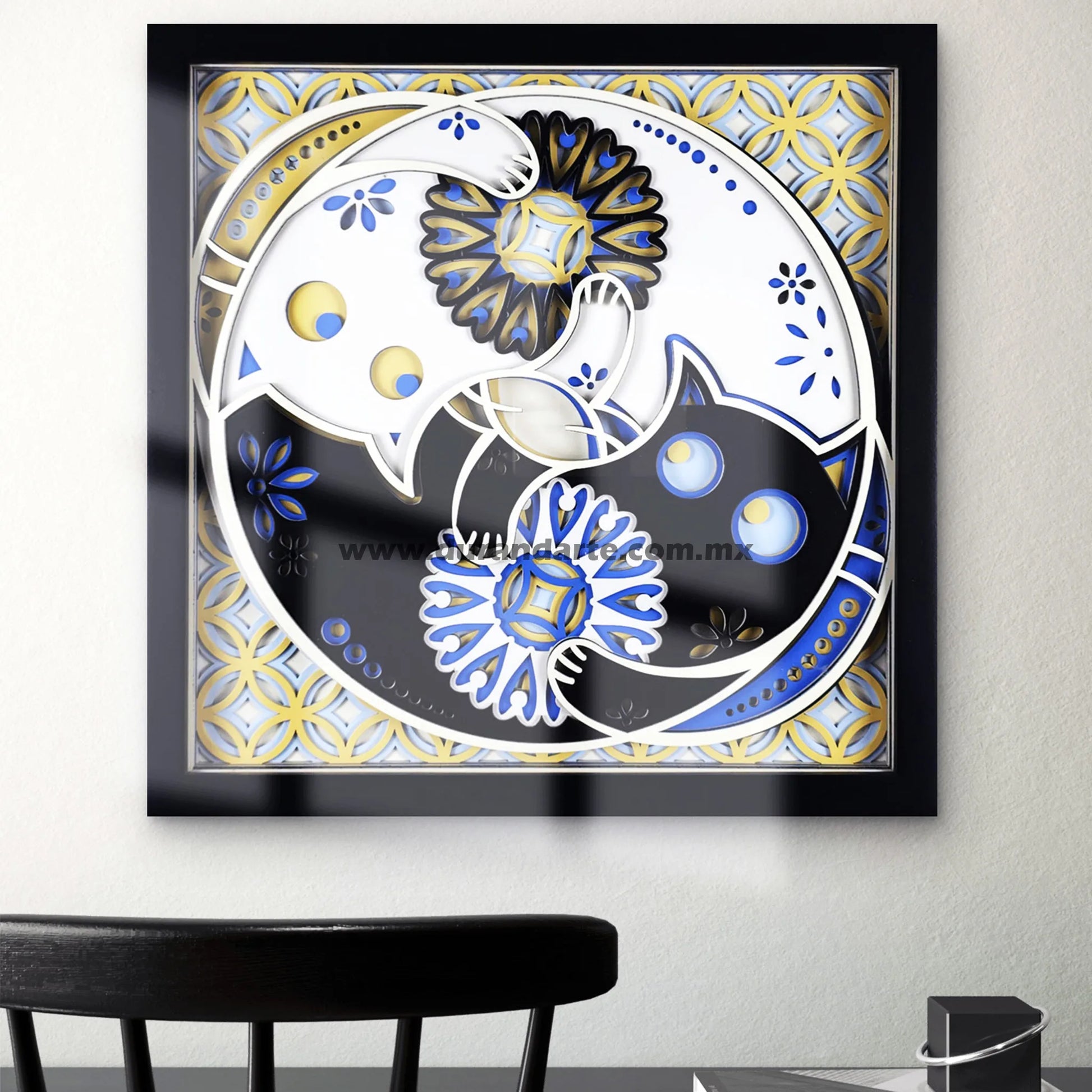 Este cuadro decorativo 3D reinterpreta el símbolo del yin-yang con dos gatos entrelazados en perfecto equilibrio. El gato blanco lleva una flor oscura de pétalos radiantes y centro dorado, mientras el gato negro luce una flor azul y blanca. Sus colas curvadas siguen la forma tradicional, enmarcadas por patrones geométricos en dorado y azul sobre un fondo de profundidad multicapa.