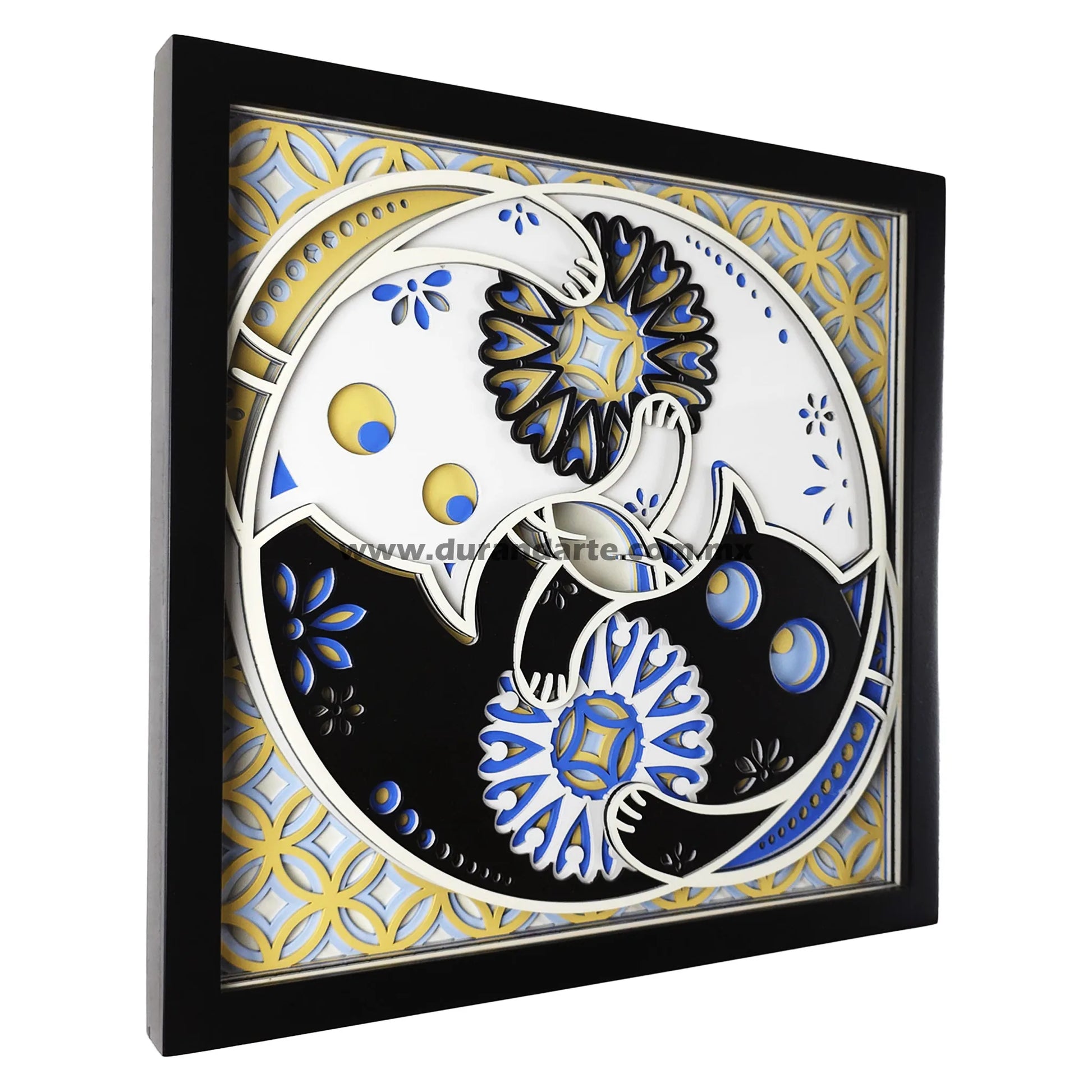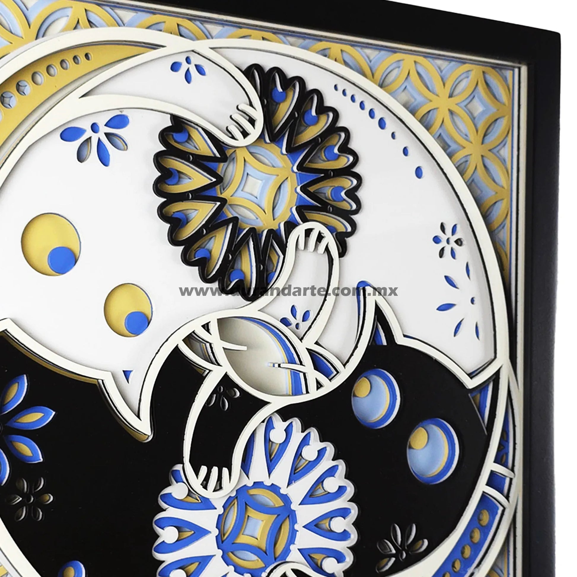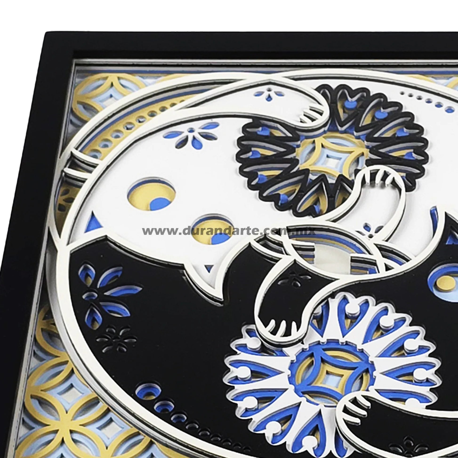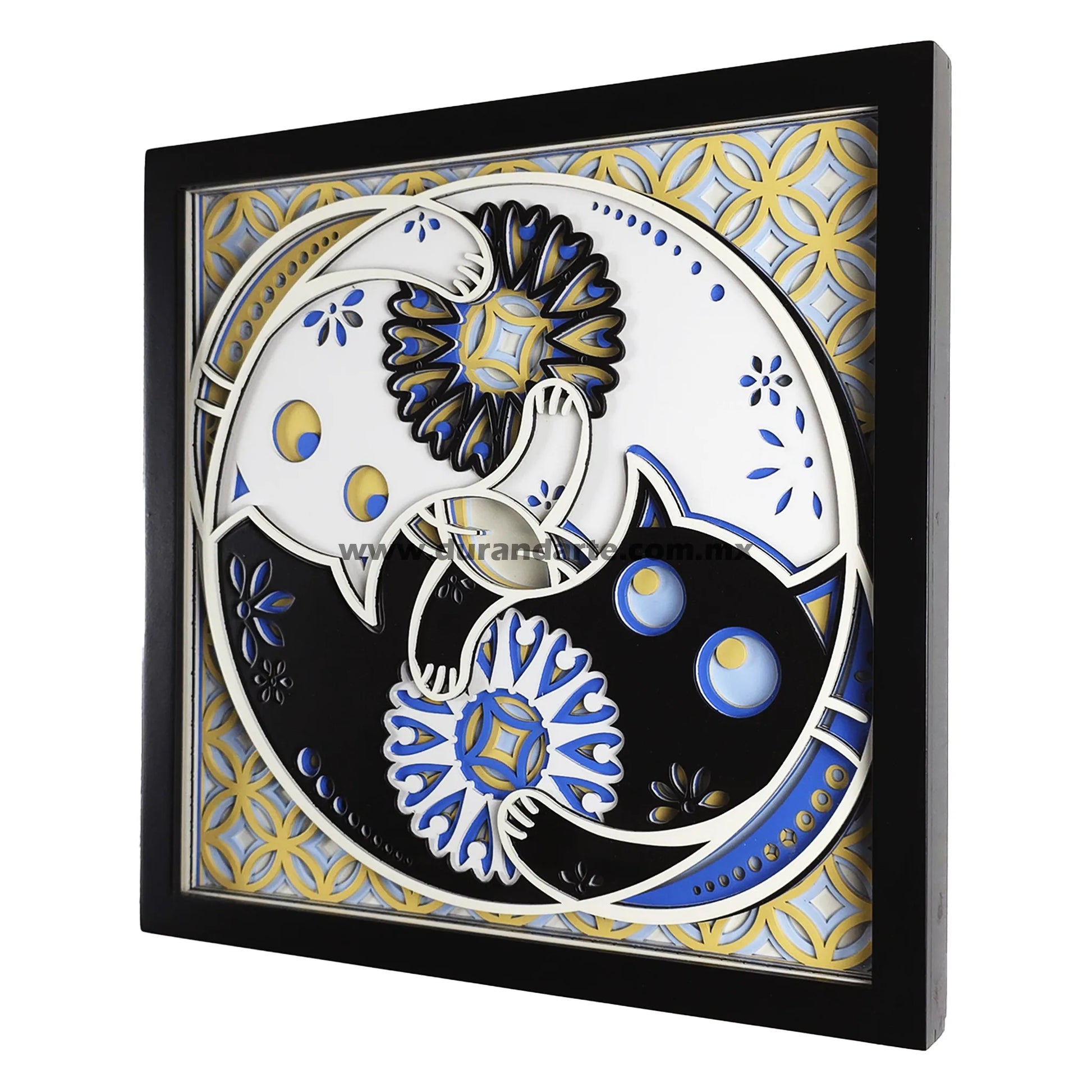 Este cuadro decorativo 3D reinterpreta el símbolo del yin-yang con dos gatos entrelazados en perfecto equilibrio. El gato blanco lleva una flor oscura de pétalos radiantes y centro dorado, mientras el gato negro luce una flor azul y blanca. Sus colas curvadas siguen la forma tradicional, enmarcadas por patrones geométricos en dorado y azul sobre un fondo de profundidad multicapa.